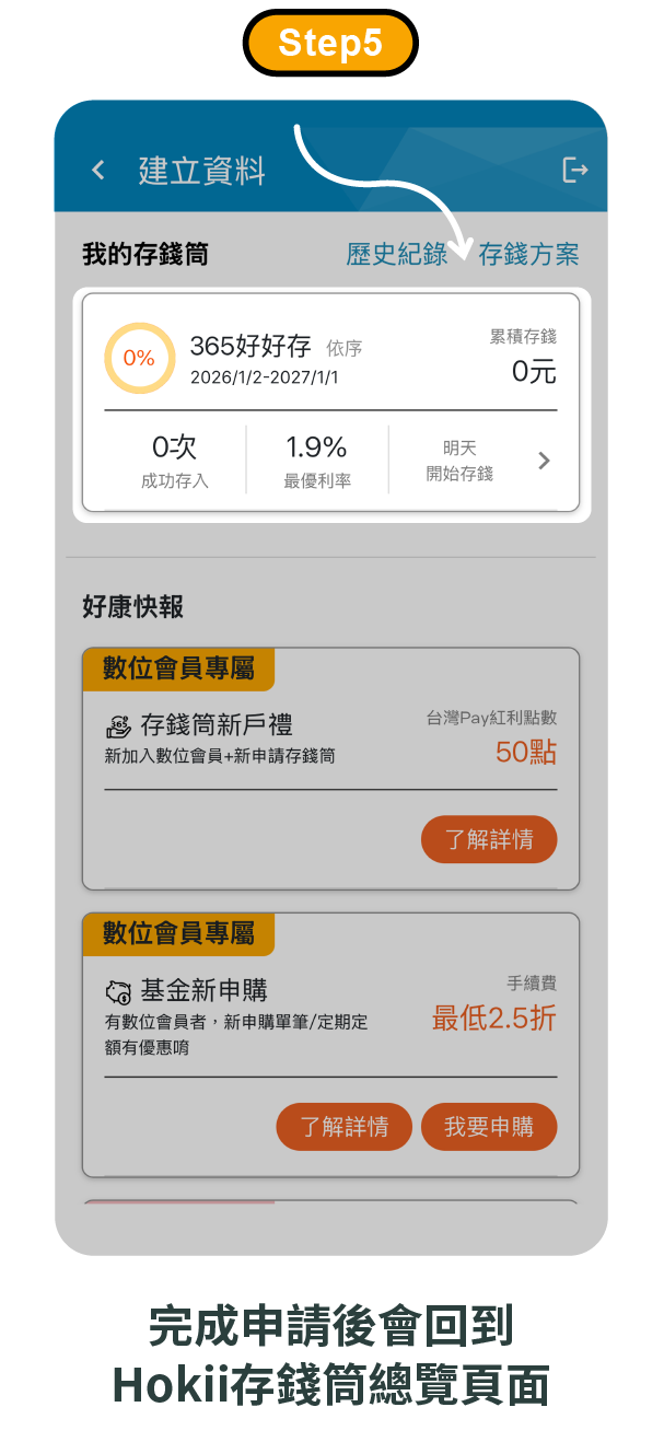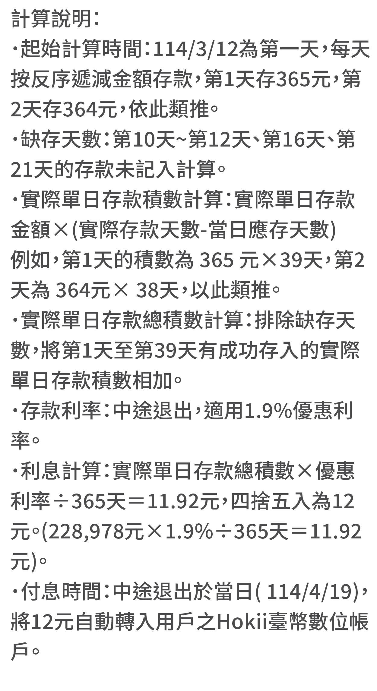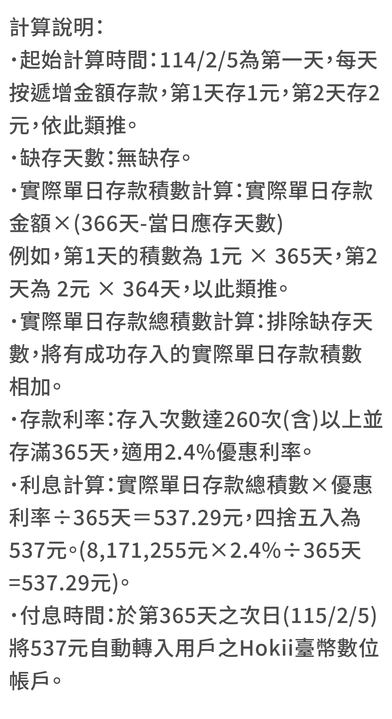 3. 計息與付息方式:將每日有成功存入的實際單日存款積數加總後,再乘以適用優惠利率除以365天計息(折算為日利率),利息未滿1元之小數點採四捨五入計算至整數,並自動轉入用戶之Hokii臺幣數位帳戶。