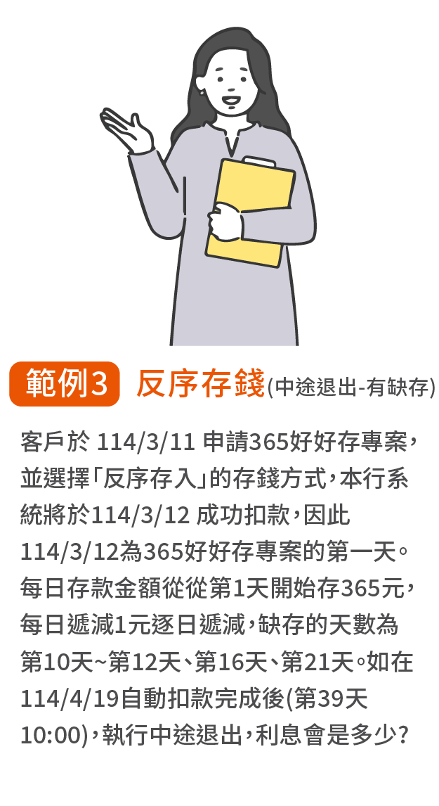 (3) 當選擇中途退出時,存款之持有天數係依每「自動扣款前」與「自動扣款後」兩部分判定: