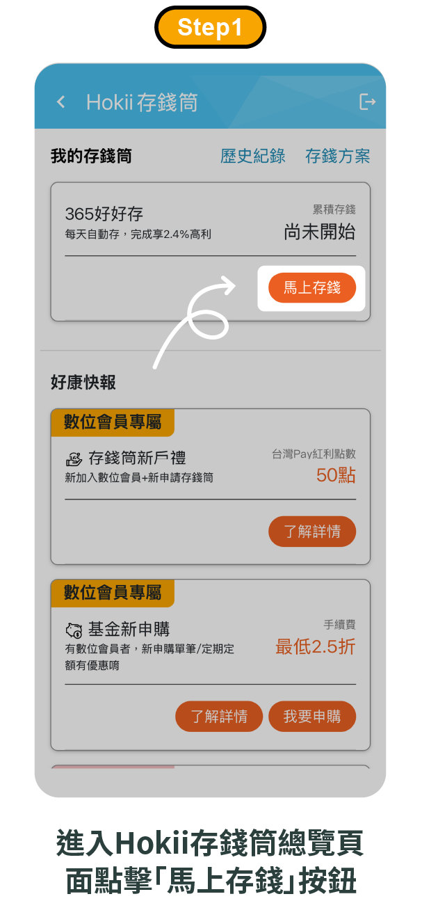 圖片Hokii存錢筒每天自動存錢1次、每次扣款金額範圍為1元至365元;但如果於本行系統執行批次扣款作業時,申請人持有之Hokii臺幣數位存款帳戶內臺幣活儲可用餘額不足,導致該次自動存錢指示無法執行,申請人不得要求臺灣企銀補執行該次扣款作業。